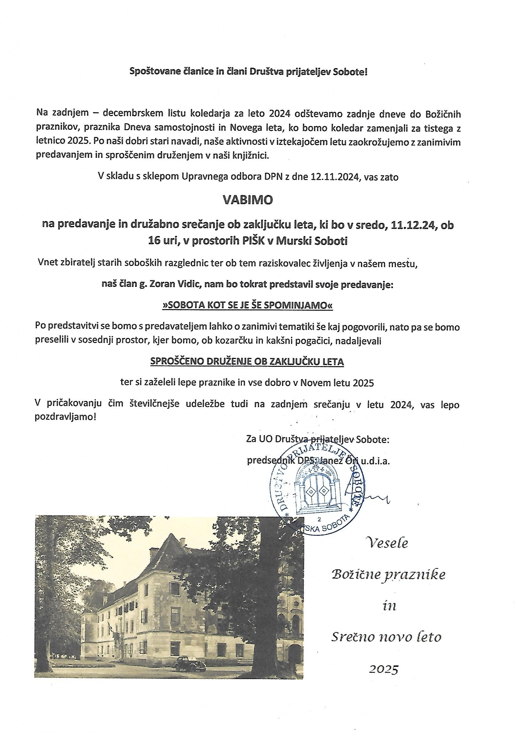 VABILO za predavanje g. Zorana Vidica: »Znani Sobočani iz prve polovice 2. stoletja« in »Druženje ob zaključku leta« (oboje 20.12.23 ob 16h v...