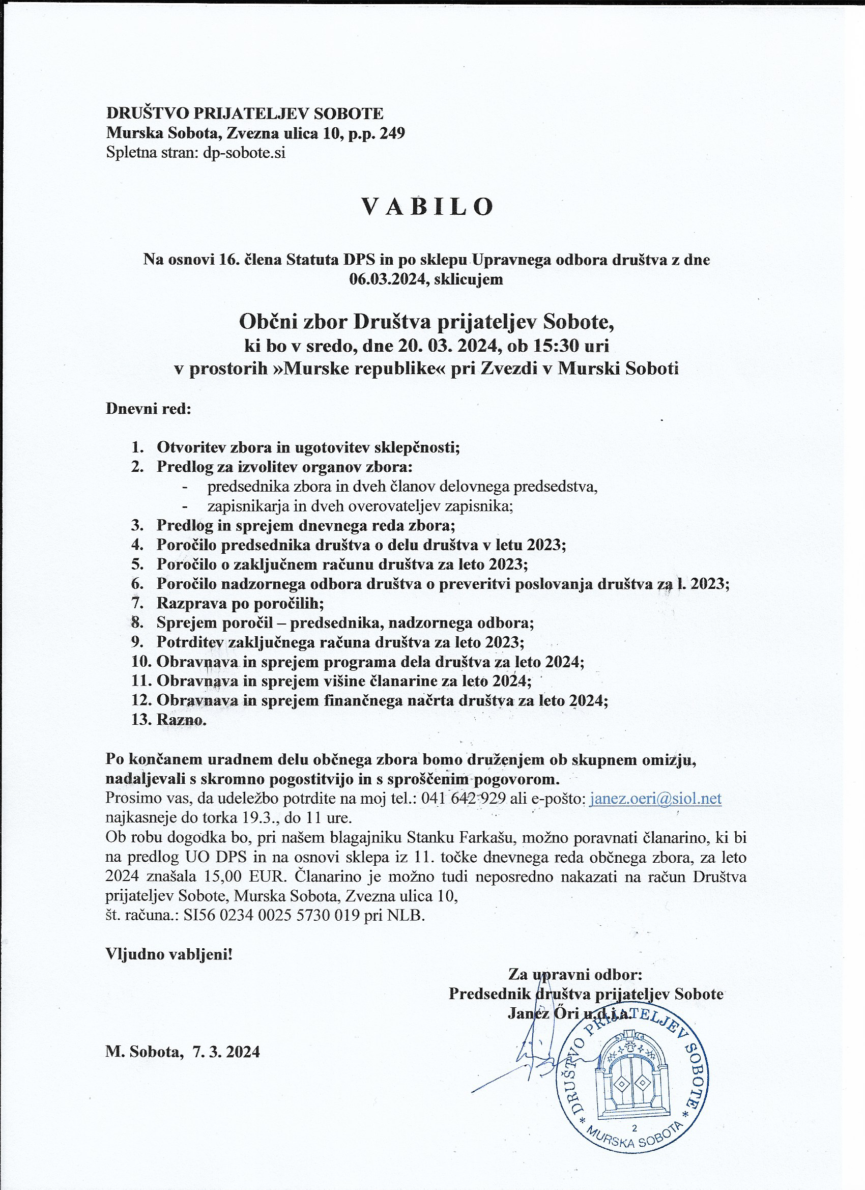DRUŠTVO PRIJATELJEV SOBOTE je na svoji 152. seji Upravnega odbora društva , dne 22. 5. 2024, obravnavalo problematiko priprav...